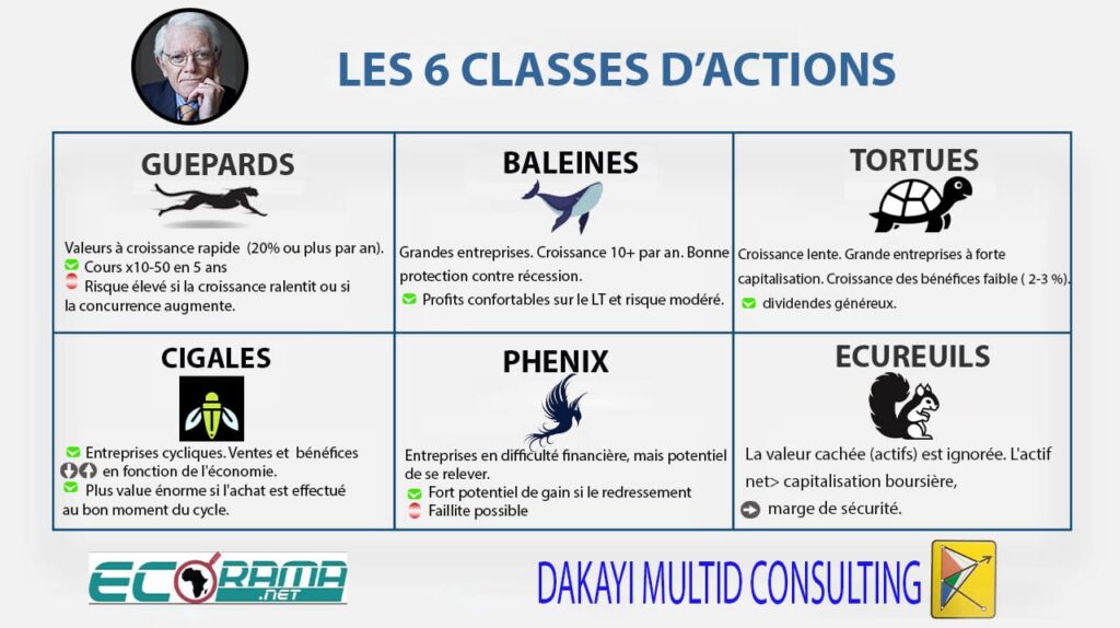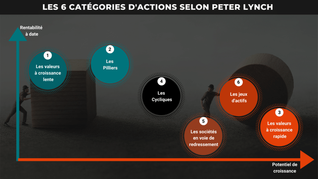 Peter Lynch a proposé une classification en 6 catégories d’actions, que nous avons choisi de rebaptiser car leur traduction littérale en français les rendrait peu compréhensibles au lecteur.